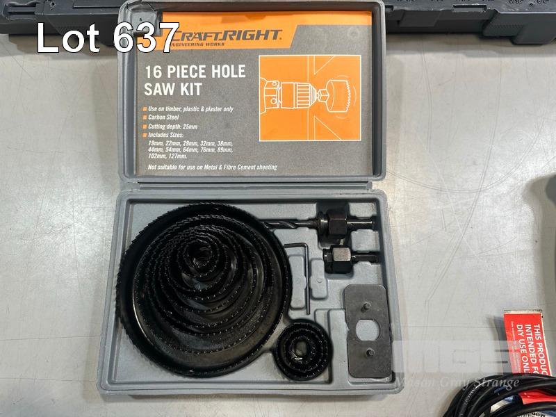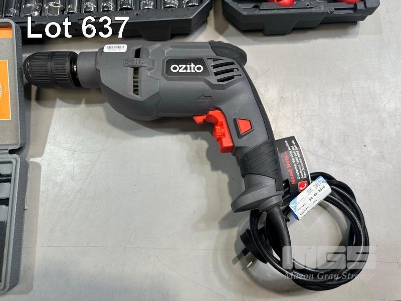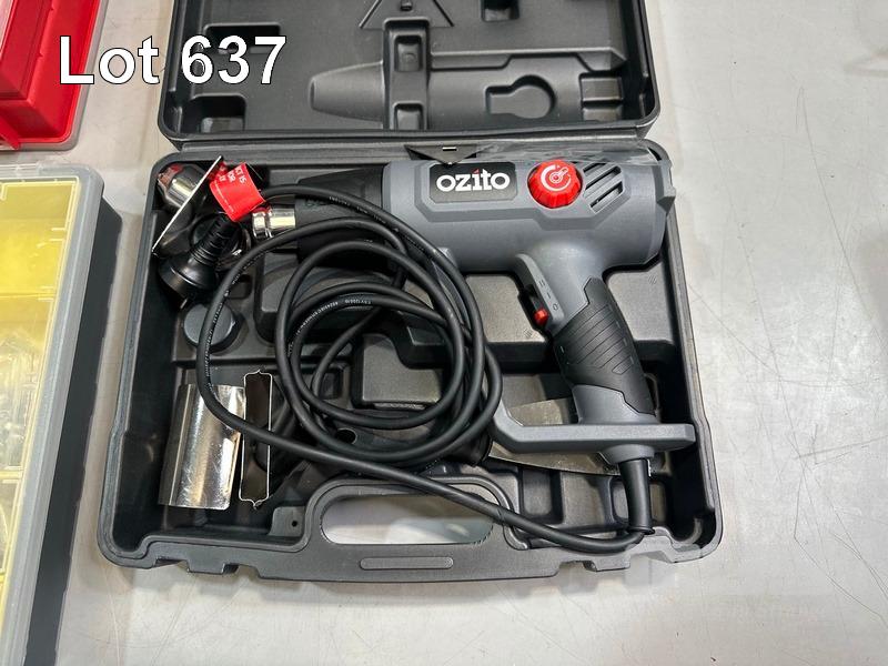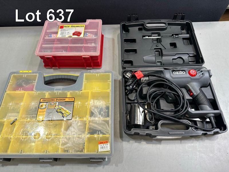 OZITO HDR-3000 HAMMER DRILL, OZITO HGN-2100 HEAT GUN & CASE, CRESCENT 170-PIECE MECHANICS TOOL SET (SOME MISSING), CRAFTRIGHT 16 PIECE HOLD SAW KIT, 2 x ORGANIZERS