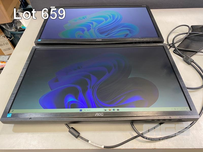 2 x MONITORS, AOC e2460Sd 24" LED WIDESCREEN, VGA, DVI (WITH CABLES) WITH FREESTANDING DUAL MONITOR STAND (NOTE: 1 x MONITOR WITH SMALL SCRATCH)