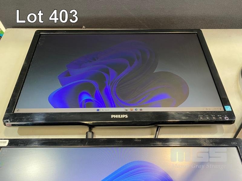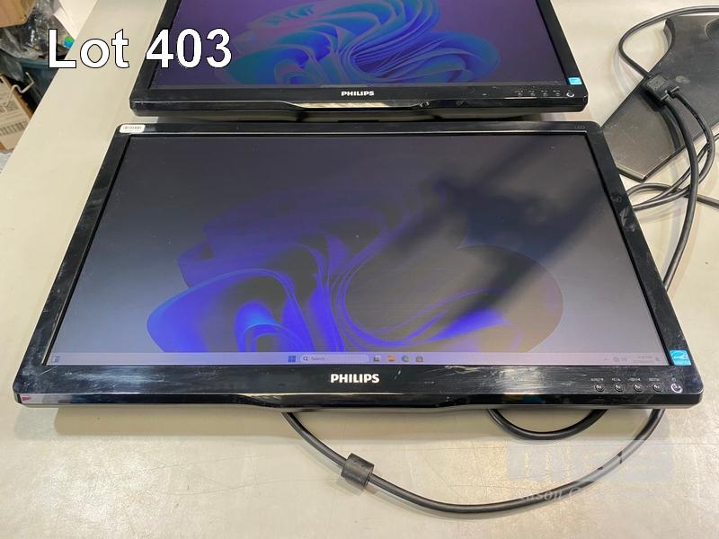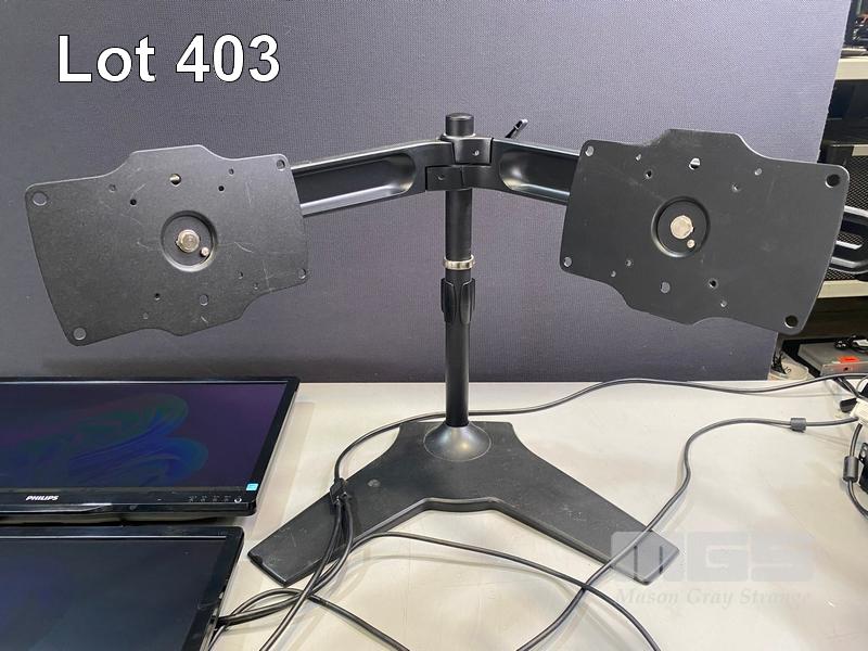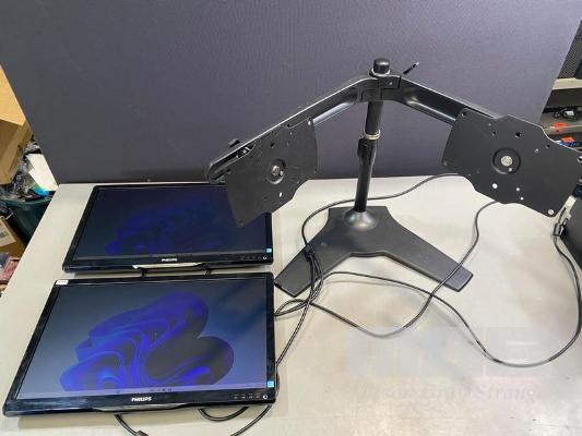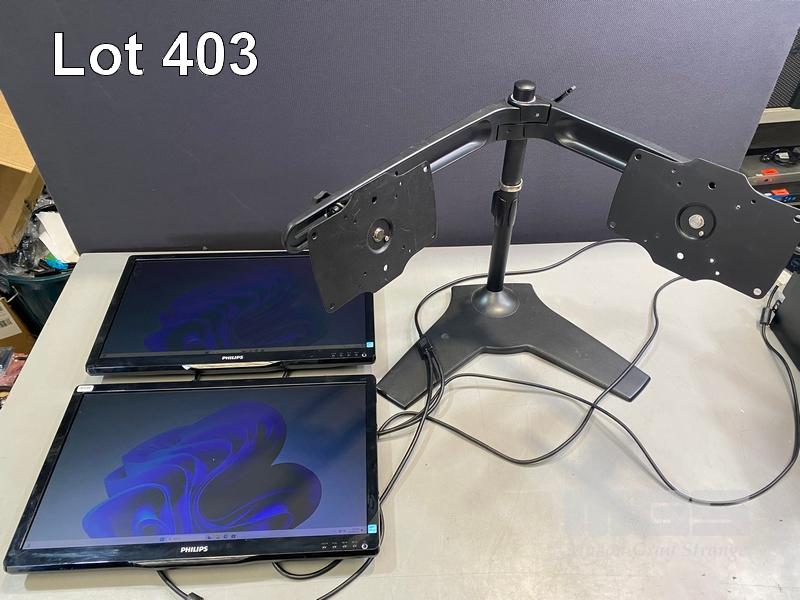 2 x MONITORS, PHILIPS 226V4LAB 21.5" LCD WIDESCREEN, VGA, DVI (WITH CABLES) WITH FREESTANDING DUAL MONITOR STAND