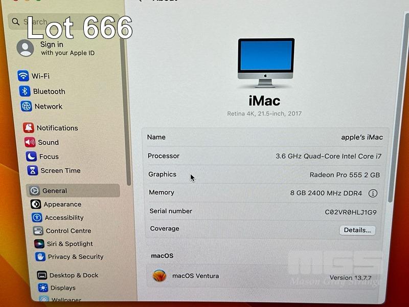 APPLE iMAC (A1418), CORE i7 7700 (7TH GEN) @ 3.6GHz, 8GB DDR4 RAM, 1TB FUSION DRIVE, BUILT-IN 21.5" RETINA DISPLAY (4096x2304), 2GB RADEON PRO 555 VIDEO, Wi-Fi, BLUETOOTH, MAC OS 13 INSTALLED, KEYBOARD & MACALLY MOUSE S/N:C02VR0HLJ1G9