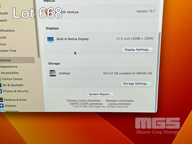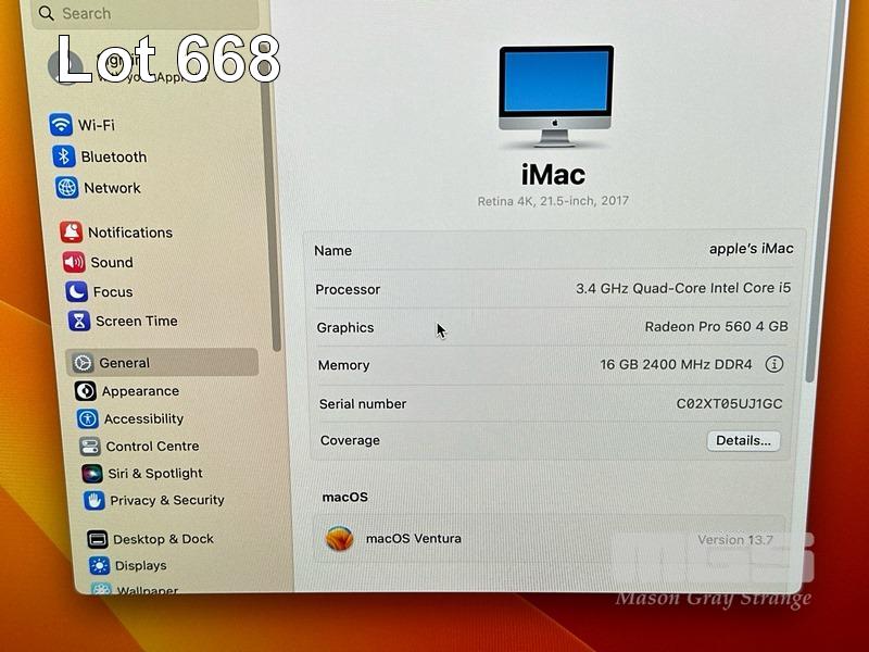 APPLE iMAC (A1418), CORE i5 7500 (7TH GEN) @ 3.4GHz, 16GB DDR4 RAM, 512GB SSD, BUILT-IN 21.5" RETINA DISPLAY (4096x2304), 4GB RADEON PRO 560 VIDEO, Wi-Fi, BLUETOOTH, MAC OS 13 INSTALLED (NO KEYBOARD, NO MOUSE) S/N:C02XT05UJ1GC