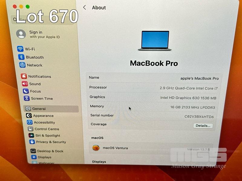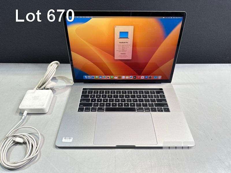 LAPTOP, APPLE MACBOOK PRO (A1707), CORE i7 7820HQ (7TH GEN) @ 2.9GHz, 16GB DDR3 RAM, 512GB SSD, 15.4" RETINA DISPLAY (2880x1800), INTEL HD GRAPHICS 630, 4GB RADEON PRO 560 VIDEO, Wi-Fi, BLUETOOTH, MAC OS 13 INSTALLED & USB-C POWER SUPPLY (NOTE: BATTERY SERVICE RECOMMENDED MESSAGE, MARKS ON SCREEN) S/N:C02V3BX4HTD6