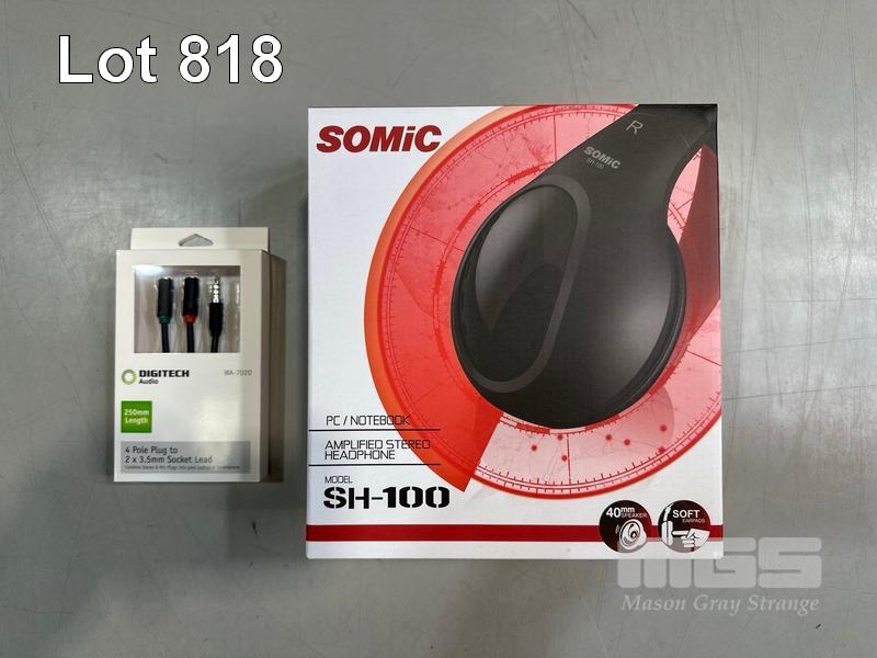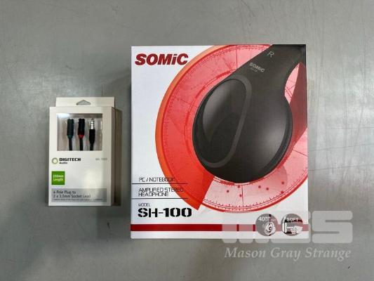 12 x SOMIC SH-100 STEREO HEADPHONES (IN BOX) 10 x DIGITECH 4 POLE PLUG TO 2 x 3.5mm SOCKET LEADS (IN BOX)