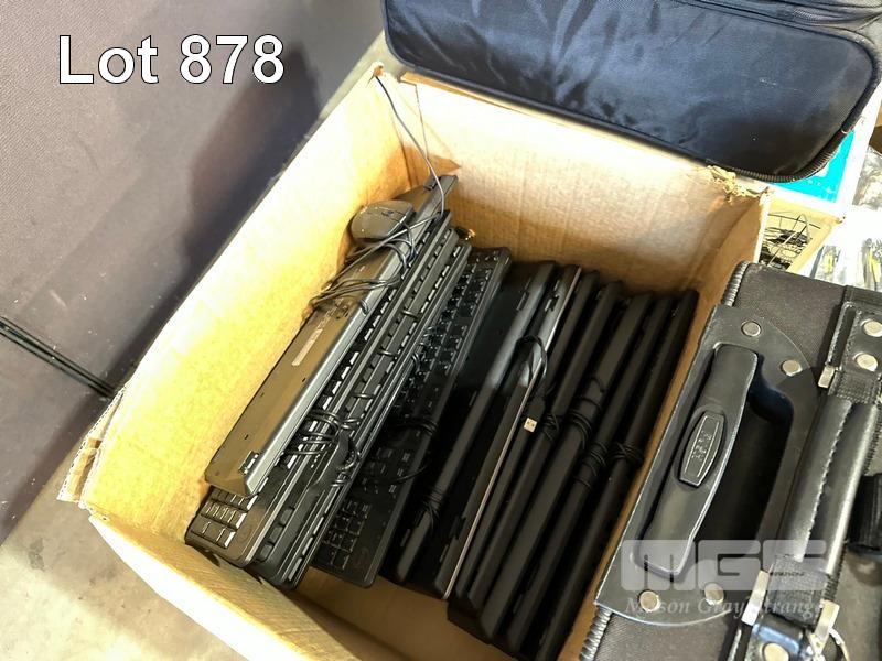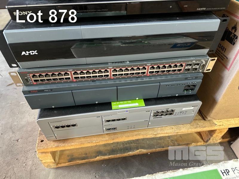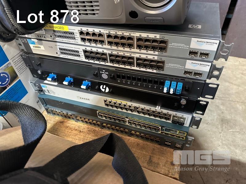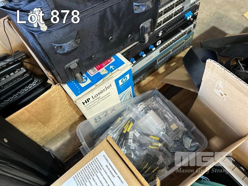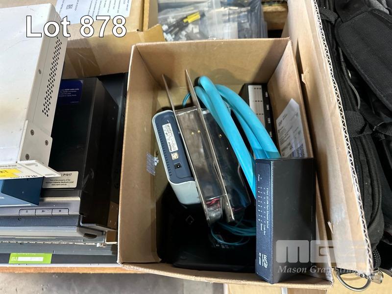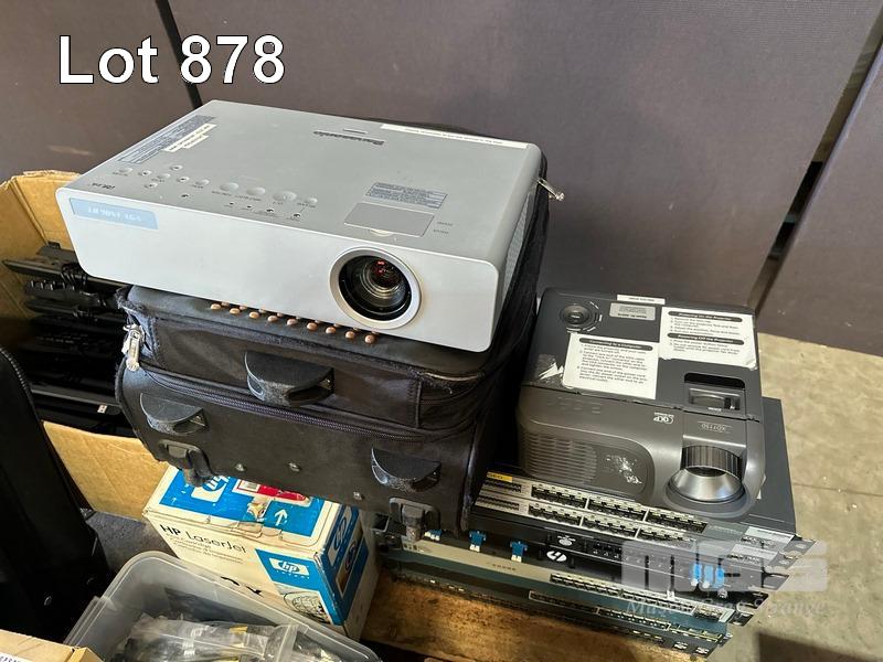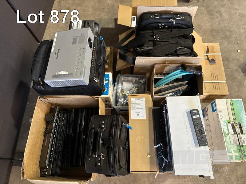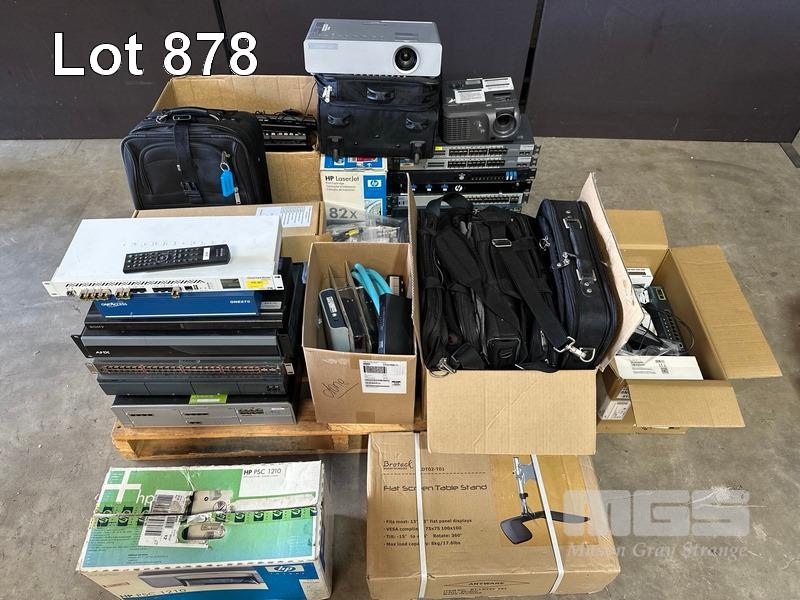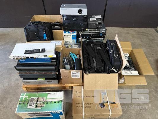 1 x PALLET LOT ASST NETWORKING, PROJECTORS, LAPTOP BAGS, HP PRINTER, MONITOR STAND, KEYBOARDS, ETC