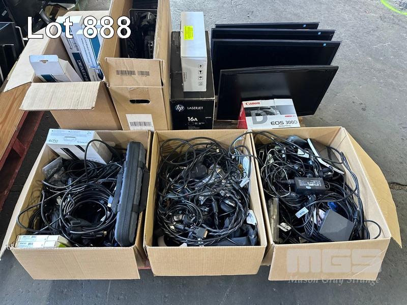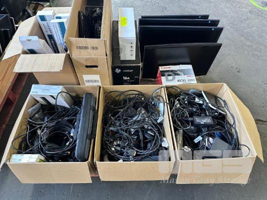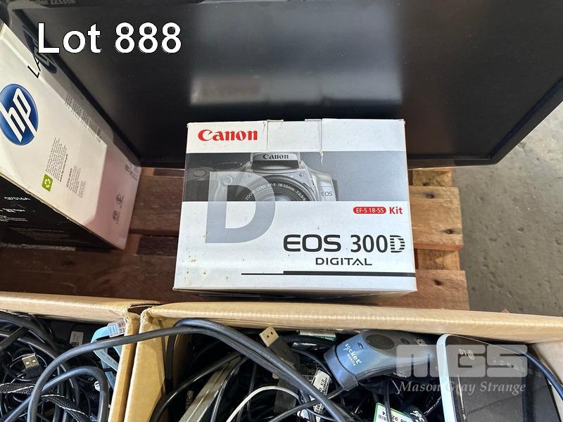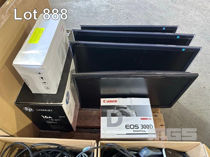 1 x PALLET LOT ASST CABLES, CANON EOS 300D CAMERA, MONITORS (NO POWER SUPPLIES), CAMERA TRIPOD, KEYBOARDS, CABLE MANAGEMENT, HP TONER CARTRIDGE