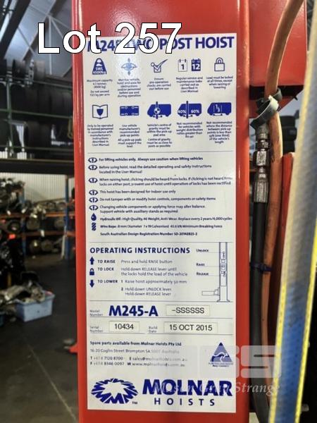 2015 2 POST HOIST, MOLNAR M245-A SWL: 4500kg S/NO: 10434 415V, 3 PHASE HARD WIRED