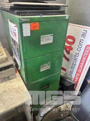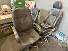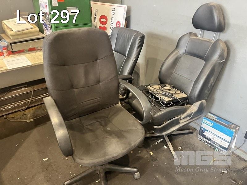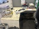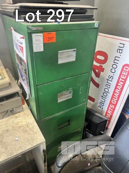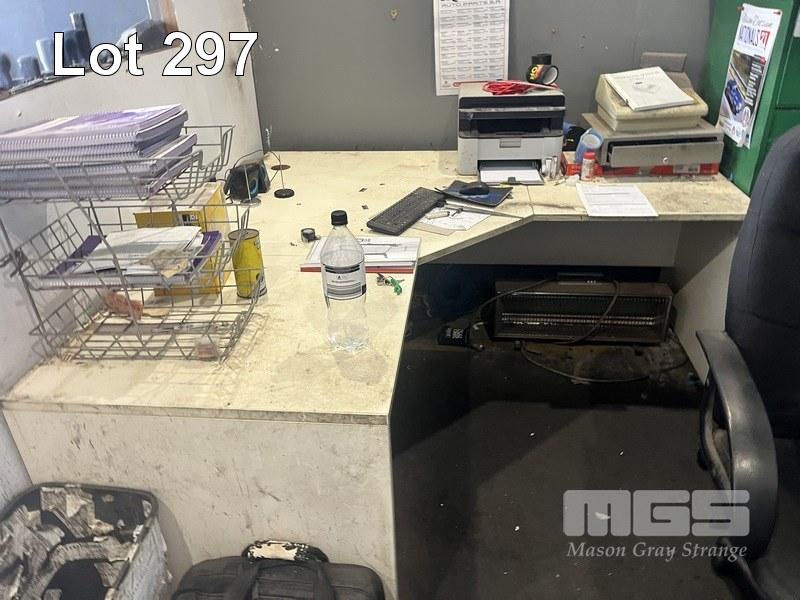 OFFICE FURNITURE INCLUDING FILING CABINET, FRAMES, 3 x CHAIRS, DESK, STOOL, FRONT COUNTER & 2 x BAYS SHELVING