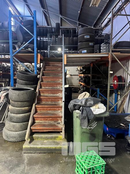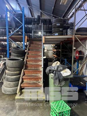 ALL PALLET RACKING & SHELVING THROUGHOUT SHED INCLUDING 3 x STAIRCASES & ALL PARTICLEBOARD COMPRISING 27 x UPRIGHTS, ASSORTED WIDTHS & HEIGHTS 224 x BEAMS, ASSORTED LENGTHS & 32 x SETS ANGLE OPEN SHELVING