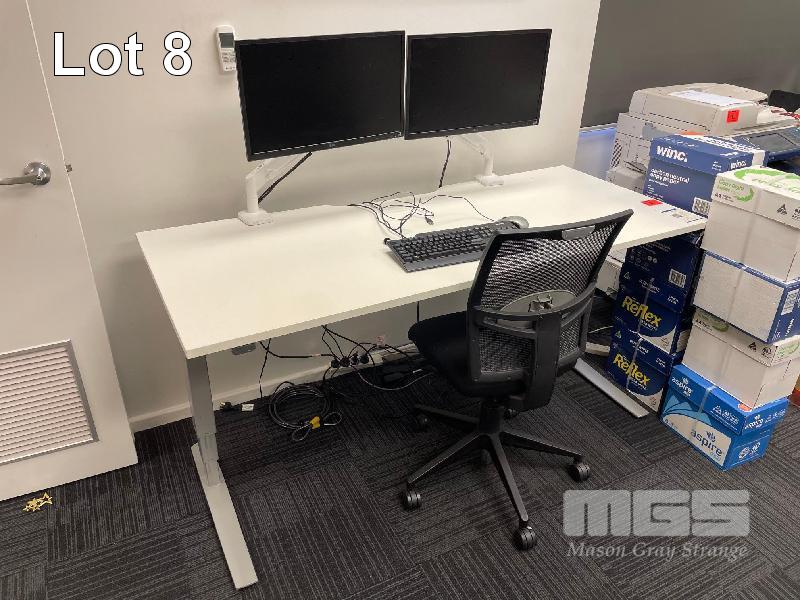 ELECTRIC RISE & FALL DESK, WHITE TIMBER LAMINATE, 1800 x 750mm WITH 2 x LG 24" MOUNTED MONITORS, BLACK FABRIC GAS LIFT CHAIR, TAMBOUR STORAGE CABINET, 900 x 500 x 950mm