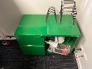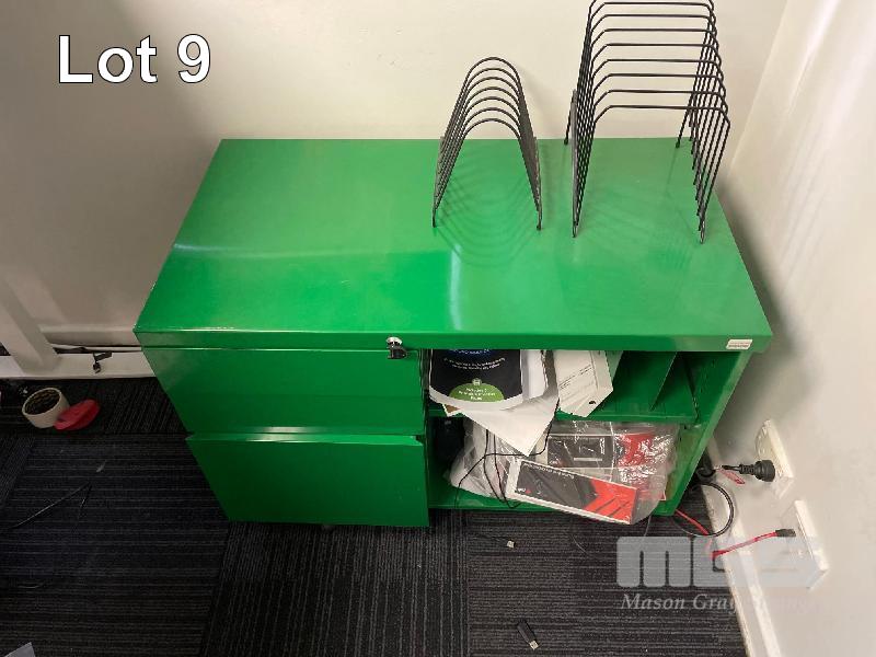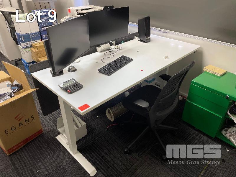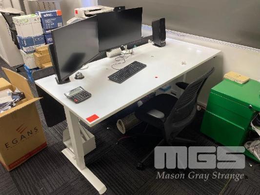 ELECTRIC RISE & FALL DESK, WHITE TIMBER LAMINATE, 1800 x 800mm WITH 2 x DELL 25" MOUNTED MONITORS, BLACK FABRIC GAS LIFT CHAIR, PAIR CREATIVE SPEAKERS, GREEN STEEL STORAGE UNIT, 900 x 500mm