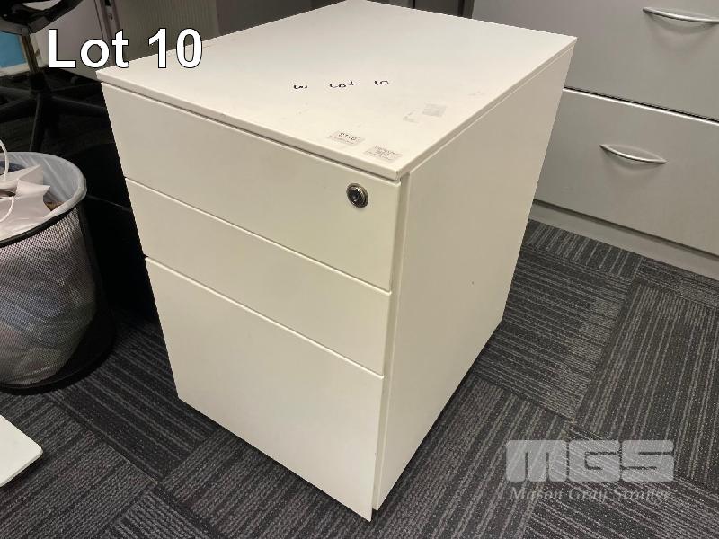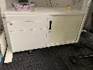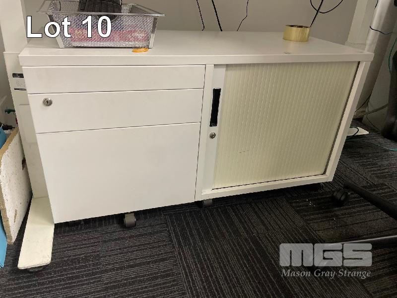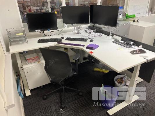 ELECTRIC RISE & FALL CORNER DESK, WHITE TIMBER LAMINATE, 1800 x 1800mm WITH 2 x DELL 25" MOUNTED MONITORS, 1 x HP 24" MONITORS, 3 DRAWER UNDER DESK MOBILE, BLACK FABRIC GAS LIFT CHAIR, WHITE STEEL STORAGE CABINET, 1050 x 460mm