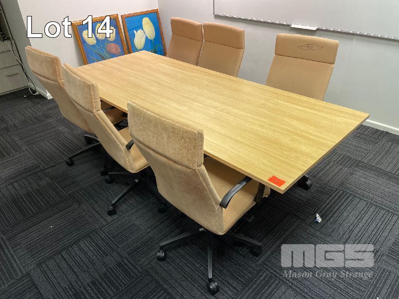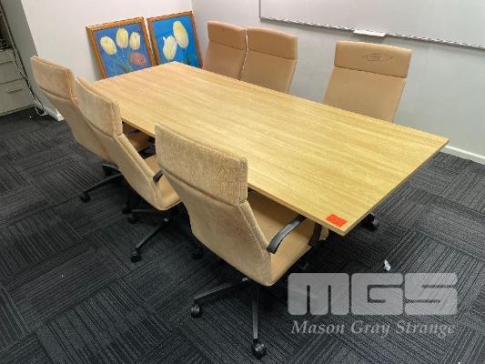 MOBILE BOARD ROOM TABLE, TIMBER LAMINATE, 2400 x 1000mm WITH 6 x PINK CLOTH SWIVEL CHAIRS, (WORN), & TIMBER LAMINATE BOOK SHELF 1800 x 1000 x 600mm
