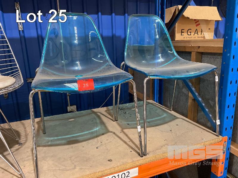 PAIR BLUE CHAIRS, PLASTIC SEATS, CHROME BASE