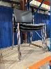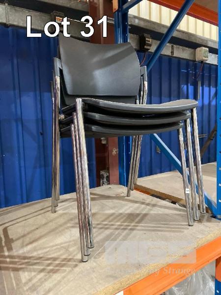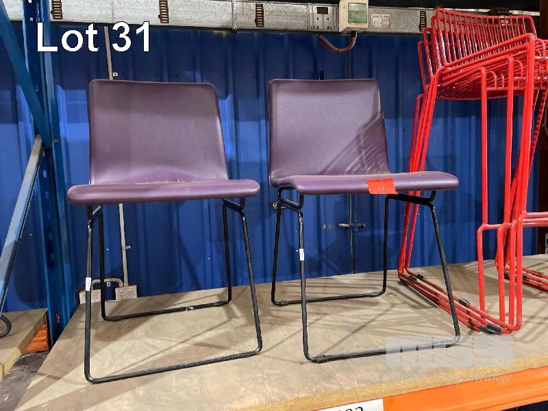 3 x PURPLE VINYL CHAIRS, 3 x RED STEEL BAR STOOLS 3 x STACKABLE CHAIRS, CHROME LEGS
