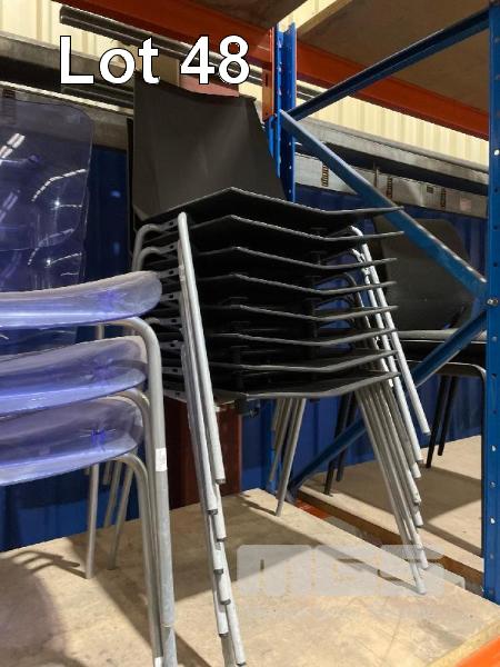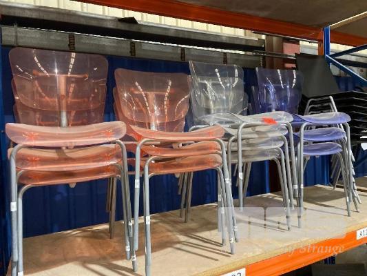 6 x RED PLASTIC CHAIRS, STEEL FRAME, 4 x CLEAR PLASTIC CHAIRS 3 x BLUE PLASTIC CHAIRS, 8 x BLACK PLASTIC CHAIRS