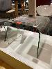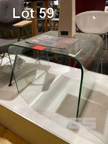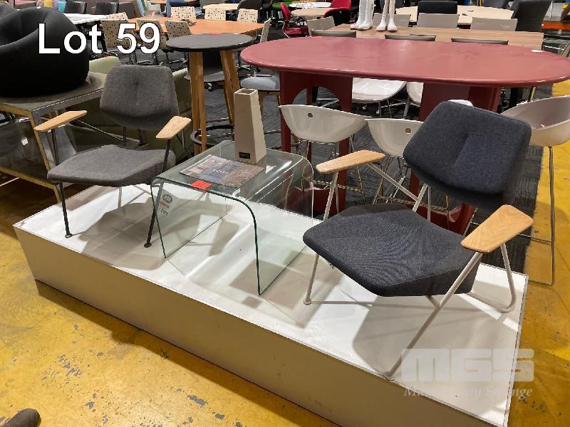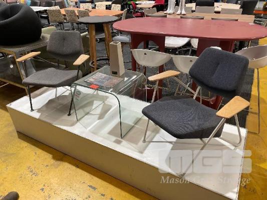 CURVED GLASS COFFEE TABLE, 480 x 550mm, PAIR VISITORS CHAIRS, GREY CLOTH, TIMBER ARM RESTS, (NOT QUITE MATCHING)