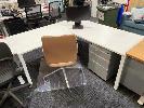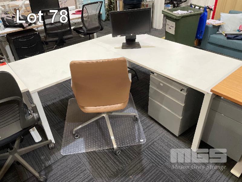 TIMBER LAMINATE DESK & RETURN, WHITE, 1800 x 1800mm, 3 DRAW UNDER DESK MOBILE, VINTAGE TAN LEATHER OFFICE CHAIR