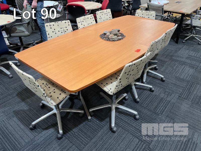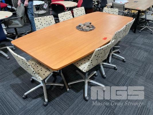 BOARD ROOM TABLE, CURVED EDGES, TIMBER LAMINATE, CHROME FRAMEW, 2420 x 1220mm, 8 x PATTERN CLOTH GAS LIFT CHAIRS, BEIGE & BLACK
