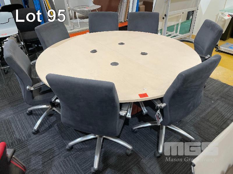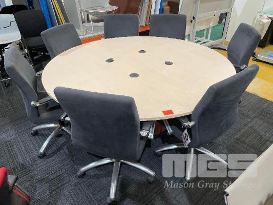 CIRCULAR MEETING TABLE, TIMBER LAMINATE, 1900mm (D), 2 x POWER OUTLETS, USB CHARGING, 7 x DARK GREY FELT CHAIRS