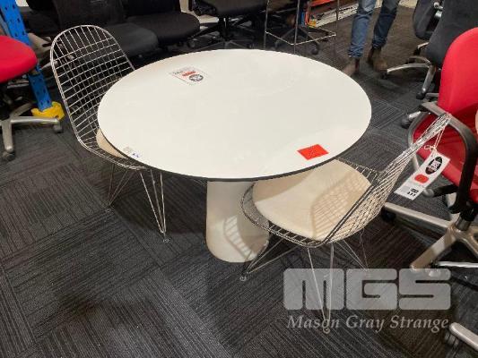 CAFE PEDESTAL TABLES, ARTIFICIAL STONE BASE, 900mm TOP, 2 x CHROME WIRE SEATS, WHITE VINYL TOPS