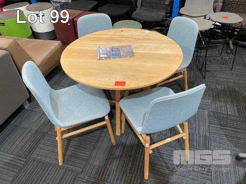 CIRCULAR TIMBER TABLE, 1000mm (D), 4 x LIGHT BLUE FELT CHAIRS, TIMBER LEGS