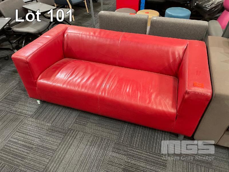 RED LEATHER 2 SEATER COUCH, 1800mm (L), STEEL FEET
