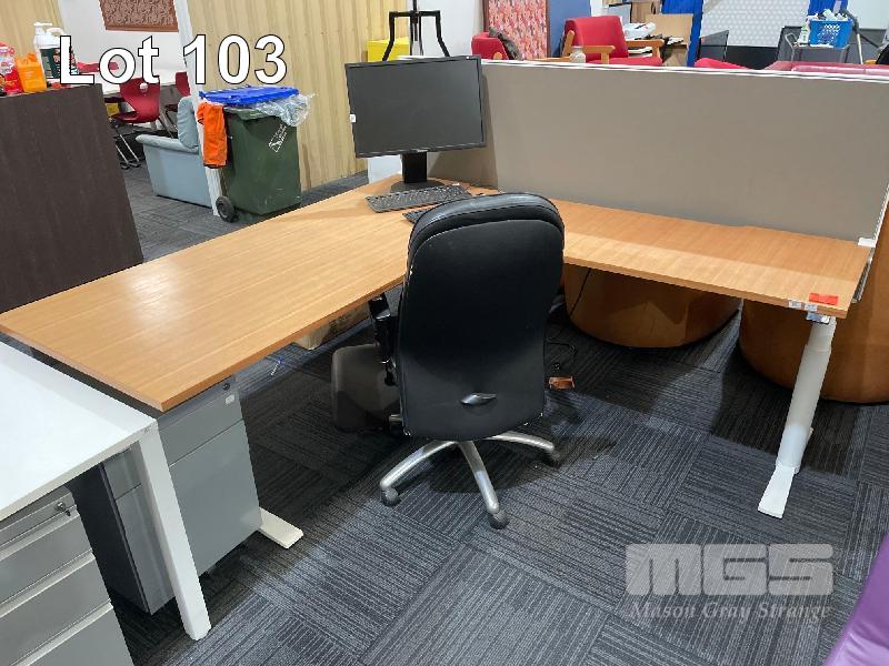 ELECTRIC RISE & FALL CORNER DESK, WOOD GRAIN TIMBER LAMINATE, 2000 x 2000mm