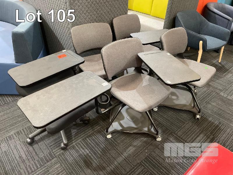 PAIR MOBILE EXAM DESKS, SWIVEL TOPS, GREY CLOTH SEATS, +1 ERGONOMIC KNEELING CHAIR