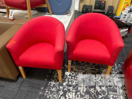 PAIR RED VISITORS CHAIRS, CLOTH, TIMBER LEGS