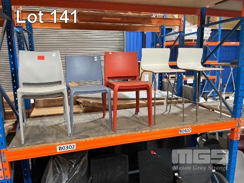 5 x PLASTIC CHAIRS, ASSORTED COLOURS, 2 x BAR STOOLS, WHITE TIMBER SEATS, CHROME LEGS