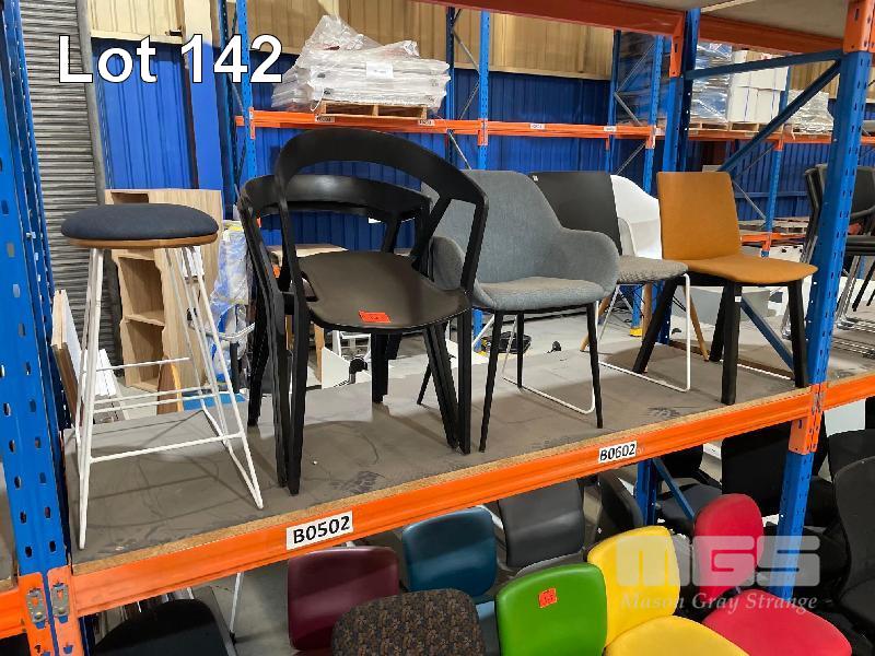 2 x BAR STOOLS, 3 x BLACK PLASTIC CHAIRS, STACKABLE, 4 x ASSORTED VISITORS CHAIRS