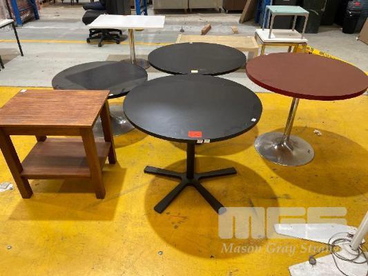 PAIR BLACK CIRCULAR TABLES, 900mm (D), 1 x BURGANDY CIRCULAR TABLE, 900mm (D), 1 x BLACK PEDESTAL COFFEE TABLE, 1000mm (D), TIMBER SIDE TABLE, 660 x 500mm