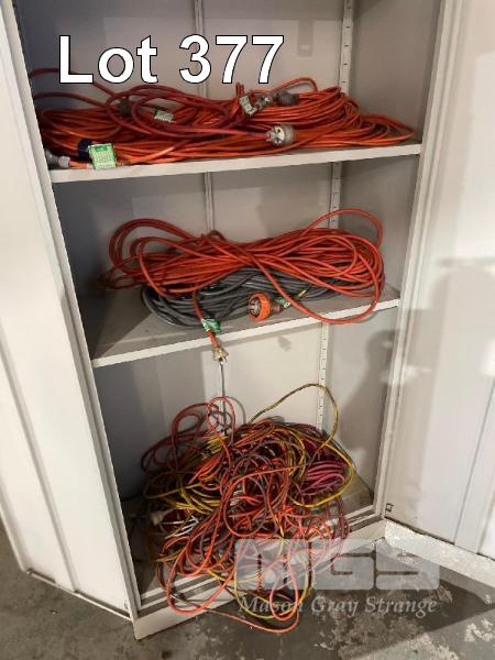 2 DOOR STEEL CABINET & CONTENTS, LARGE QTY 10AMP & 15AMP EXTENSION CORDS