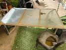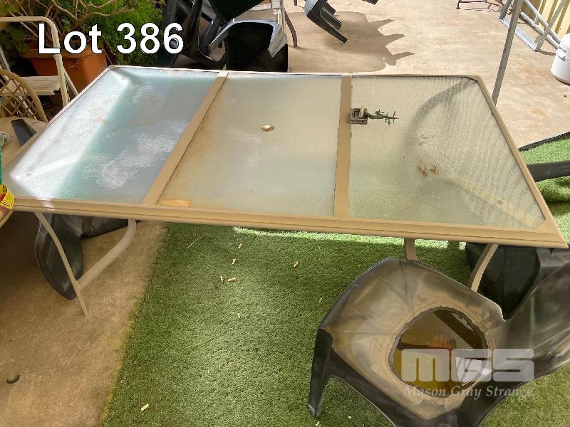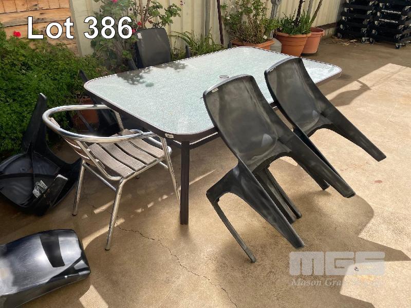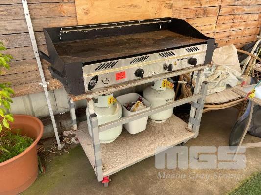 FOOTY MASTER 4 BURNER BBQ, 2 x GAS BOTTLES, DART BOARD, 2 x GLASS TABLES, 8 x PLASTIC CHAIRS, 4 x CIGARETTE BINS