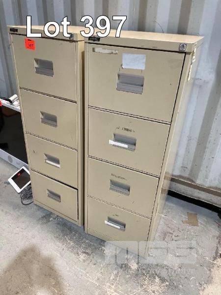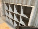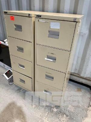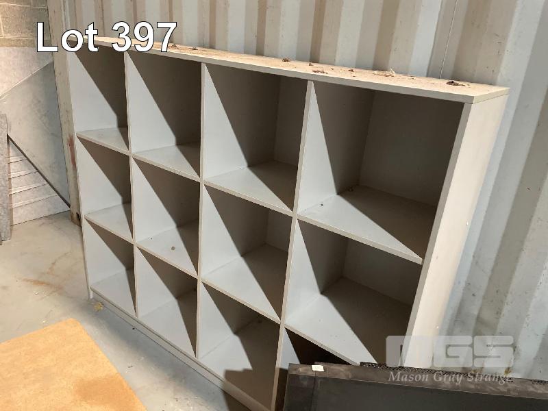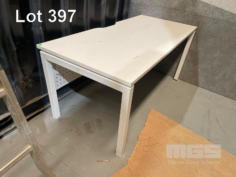 2 x STEEL 4 DRAW FILING CABINETS, 5 x WORK TABLES, GREY TIMBER LAMINATE (ON CONTAINER) 1 x WHITE TIMBER LAMINATE DESK 1800 x 900mm, 1 x 12 HOLE PIGEON HOLE UNIT, 1700 x 1400 x 400mm