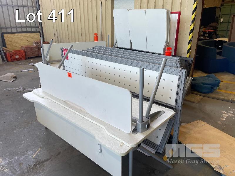 6 x WHITE TIMBER LAMINATE DESKS, 5 x OFFICE PARTITIONS