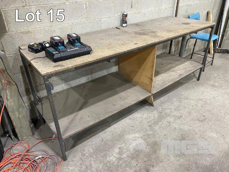 2 TIER WORK BENCH, GALV FRAME, CHIPBOARD TOP, (NEEDS REPLACING), 2350 x 715 x 910mm (H)