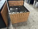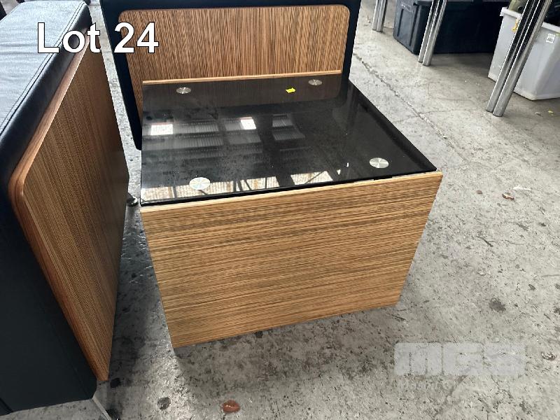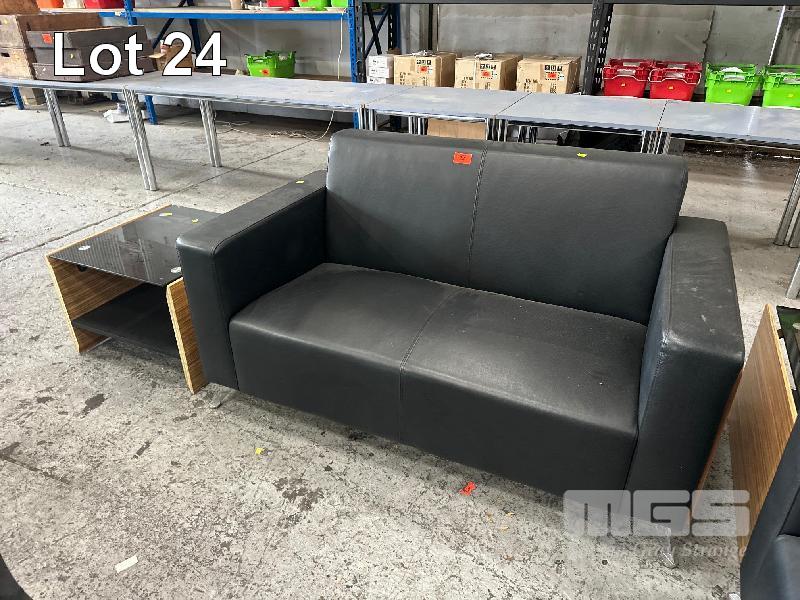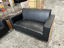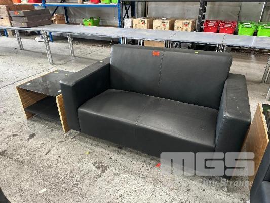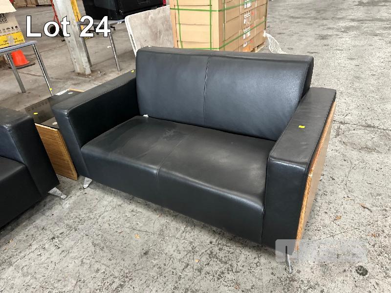 OFFICE LOUNGE SET 2 x 2 SEATER COUCHES, BLACK LEATHER, TIMBER LAMINATE SIDES, 1500mm (L) 2 x GLASS TOP SIDE TABLES, TIMBER LAMINATE SIDES 600 x 600 x 430mm (H)