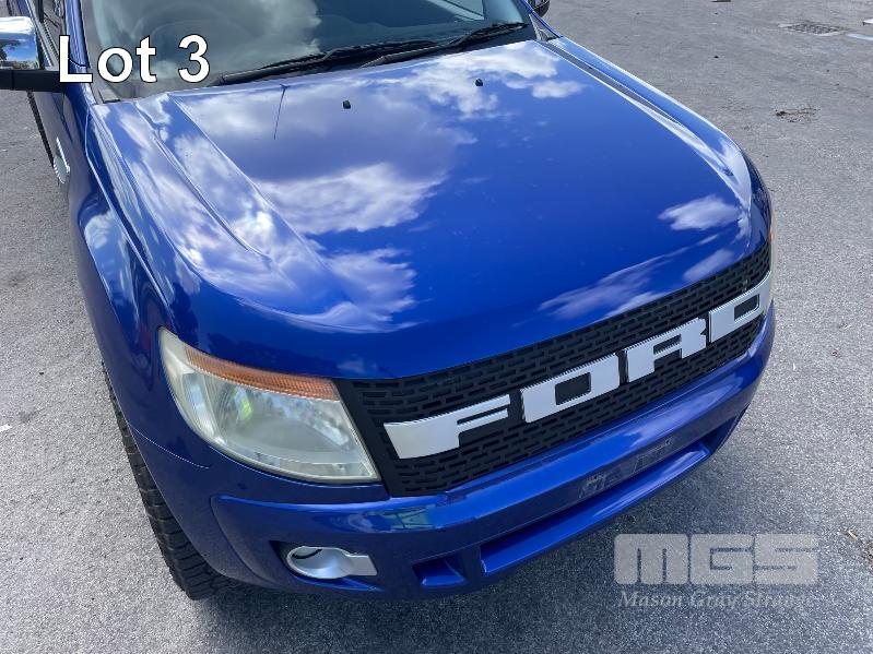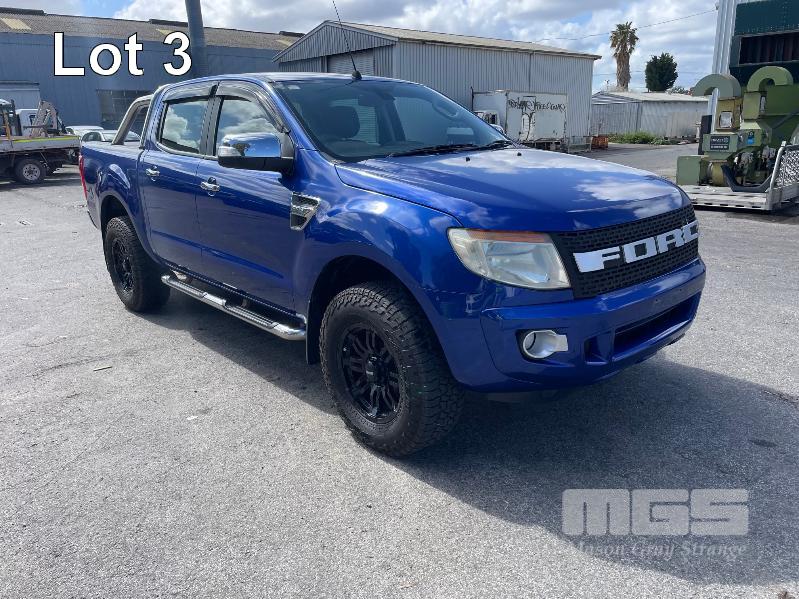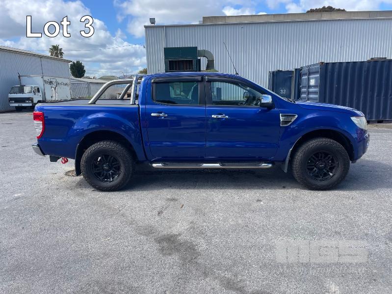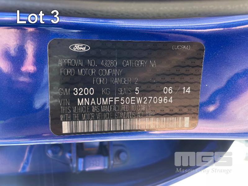 2014 FORD RANGER 2 PX DUAL CAB UTE 4X4 (PLEASE READ VEHICLE NOTES) REG: NO PLATES VIN: MNAUMFF50EW270964 ODO: 165,997kms SHOWING 3.2L DTFI DT5, 6 SPEED AUTO, DIESEL, BLUE, 4 DOORS, 4 SEAT, 4X4 (PLEASE READ VEHICLE NOTES) ABS, AIR CON, ALLOY WHEELS, CENTRAL LOCKING, CRUISE CONTROL, POWER STEERING, POWER WINDOWS, SIDE STEP, SPARE WHEEL, TOW BAR, TRACTION CONTROL, ELECTRIC ROLL TOP WITH REMOTE MECHANICS NOTE: "ON START UP NOTICED ENGINE NOISE - SUSPECT BENT CON ROD DUE TO WATER ENTERING CYLINDER THROUGH EGR COOLER - REQUIRES FURTHER INVESTIGATION" KEY #54 (WITH 2 KEY/S, WITH OWNER'S MANUAL, WITH SERVICE BOOKS)