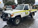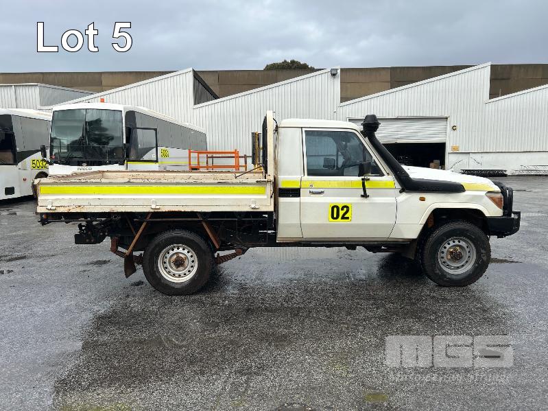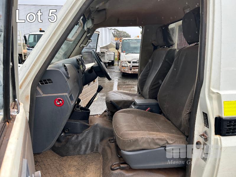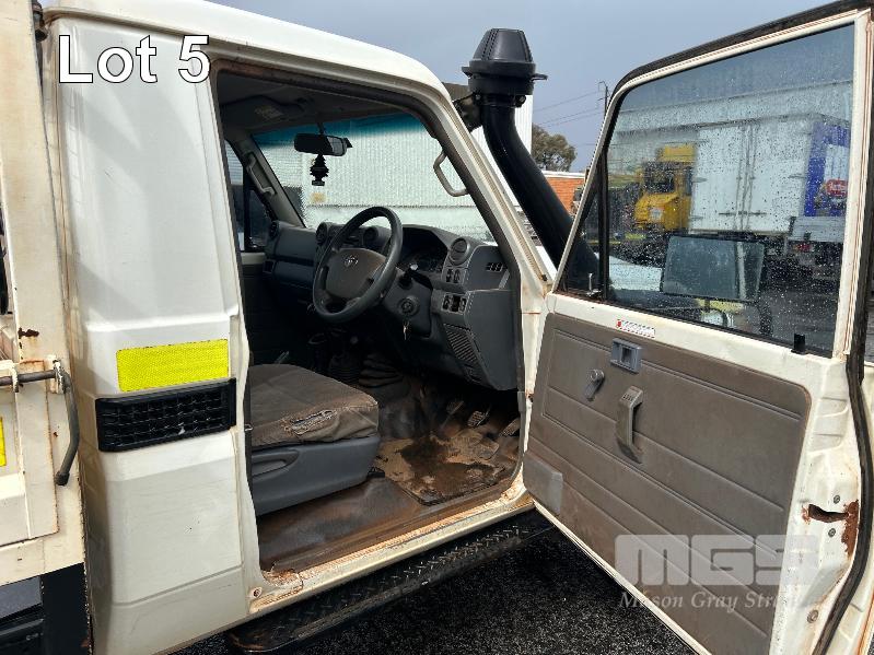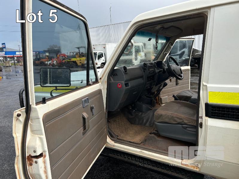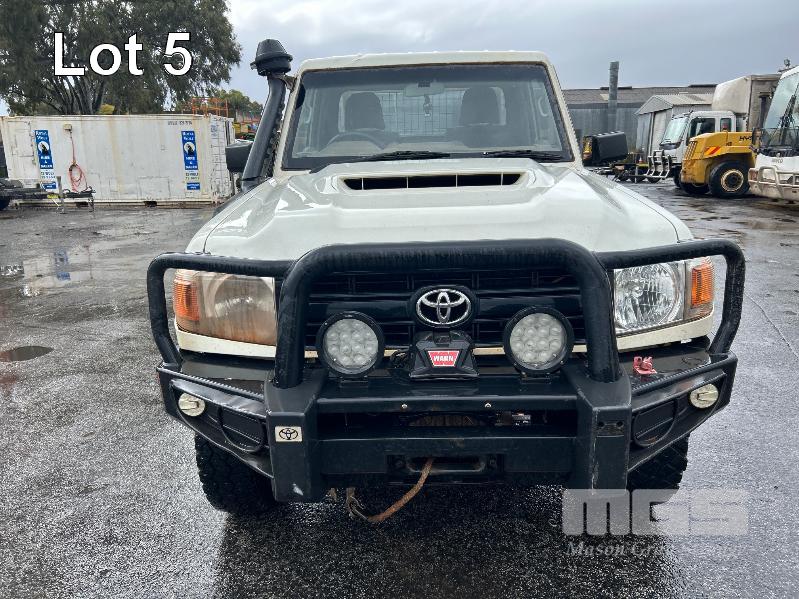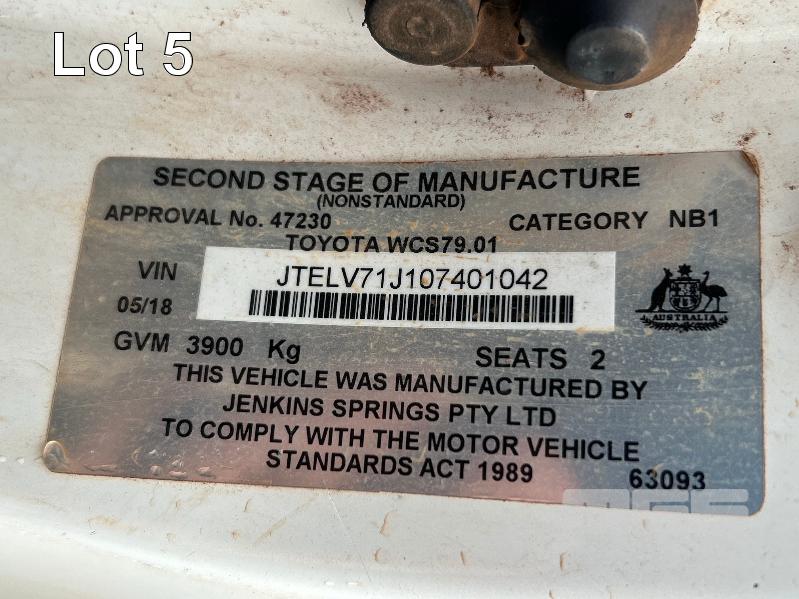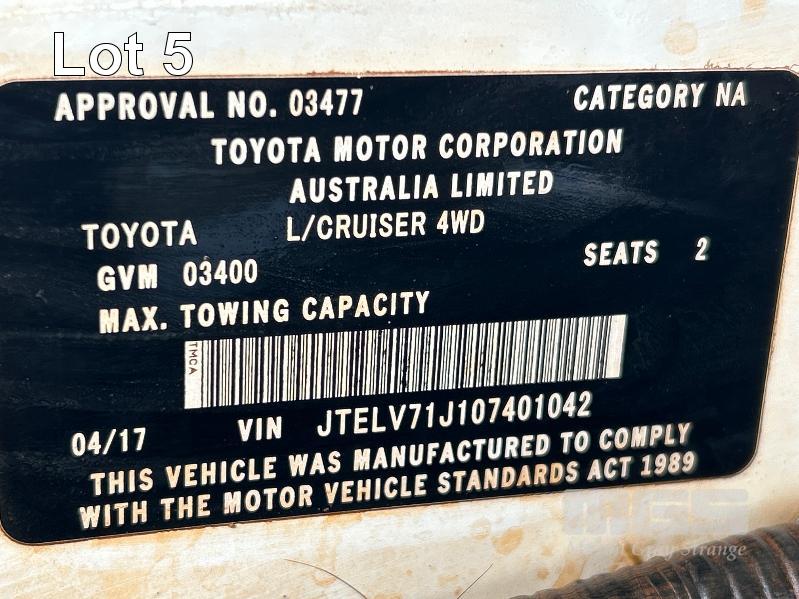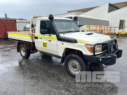 2017 TOYOTA LANDCRUISER VDJ79R SINGLE CAB TRAY TOP 4x4 REG: NO PLATES VIN: JTELV71J107401042 ODO: 172,954ksm SHOWING V8 TURBO DIESEL, 4.5 LITRE, WHITE DUCO, 2 DOORS, 2 SEAT, 4x4 ABS, AIR BAG, AIR CON, BULL BAR, CARGO BARRIER, CD PLAYER, CRUISE CONTROL, DECALS, SIDE STEP, STEEL TRAY, TOW BAR, PLANT NO: EXP02 DUAL BATTERIES SNORKEL AIR INTAKE FRONT MOUNT WINCH, LED SPOT LIGHTS REAR SLIDE OUT TRAY KEY #48 (WITH 1 KEY/S) CONDITION: ENGINE - RUNS BUT HAS A LOT OF TAPPET NOISE - NO OIL PRESSURE SHOWING ON GAUGE ALL FAULTS - NOTES SAY ENGINE MAY HAVE OVERHEATED