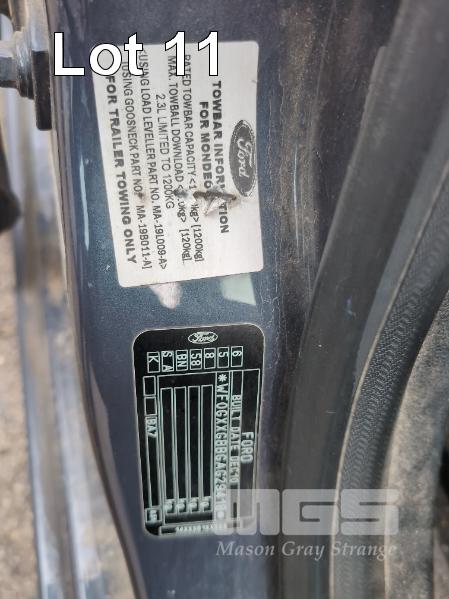 2011 FORD MONDEO LX WAGON REG: S114 1SZ (SA) (EXPIRED) VIN: WF0GXXGBBGAG29418 ODO: 273,947ksm SHOWING 2.0L DURATOG-TDCi ENGINE, AUTOMATIC TRANSMISSION, TURBO DIESEL, MIDNIGHT GREY DUCO, 5 DOORS, 5 SEAT, FRONT ABS, AIR CON, CENTRAL LOCKING, POWER STEERING, POWER WINDOWS, ROOF RACKS, SPARE WHEEL, TOW BAR, ENGINE LIGHT LIT, TRANSMISSION FAULT KEY # 34 (NO PAPERS, WITH 1 KEY/S, WITH OWNER'S MANUAL, WITH SERVICE BOOKS)