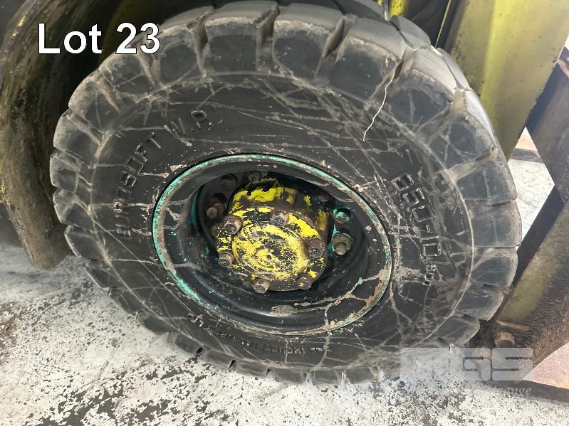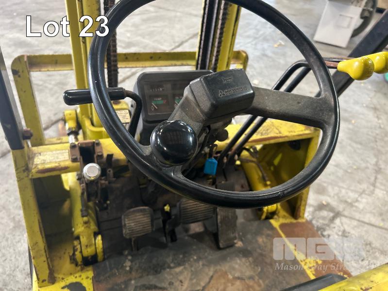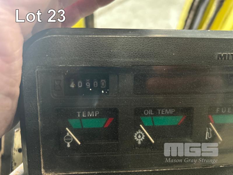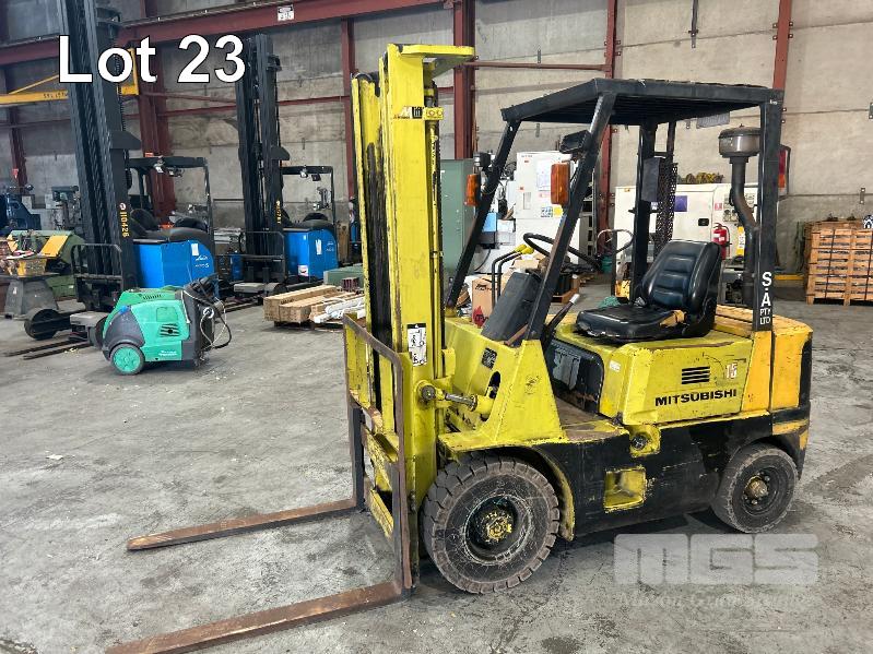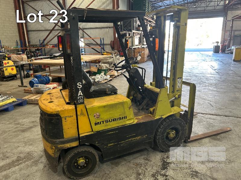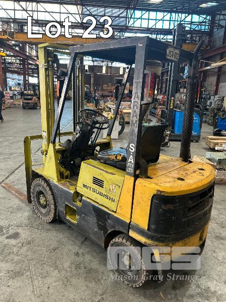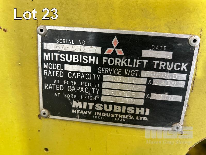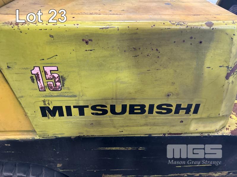 MITSUBISHI FORKLIFT MOD: FD15 REG NO: JSV 802 S/NO: F16A-53247 4 CYLINDER DIESEL ENGINE HRS SHOWING: 4090 RATED CAPACITY 3000 LB MAX LIFT HEIGHT: 171 INCH 2 STAGE MAST, SOLID TYRES KEY #19