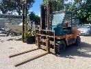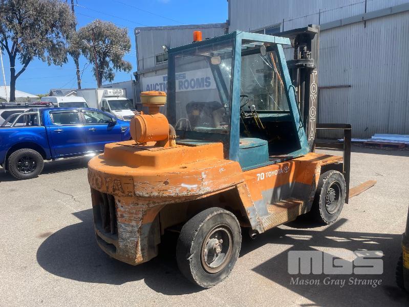 TOYOTA FORKLIFT MOD: 70 CAPACITY: 7,000kg DIESEL HOURS: 3,636 2 STAGE MAST, CLEAR VIEW DUAL FRONT WHEELS NOTE: HYDRAULIC LEAKS, CRACKED WINDSHIELD, RUNS & DRIVES KEY #13