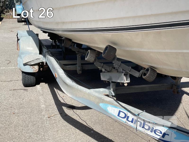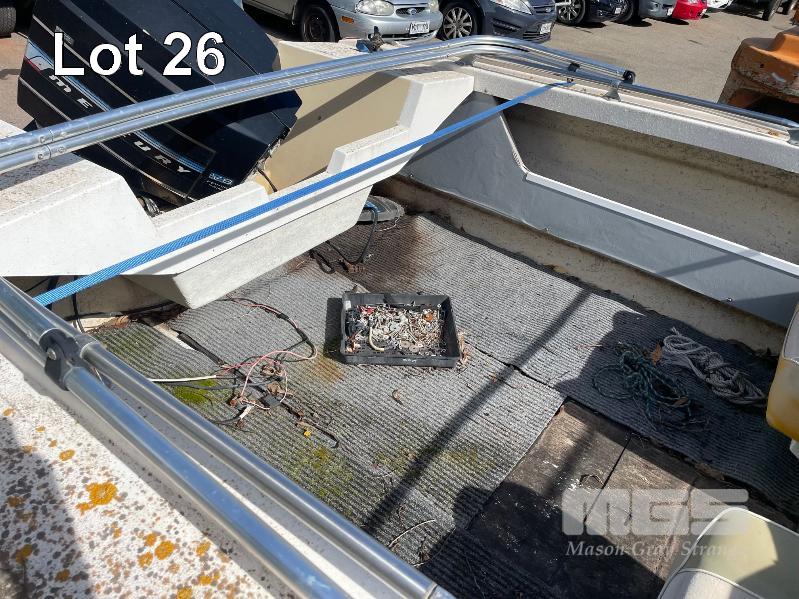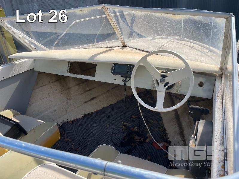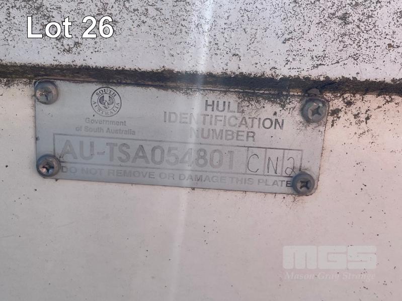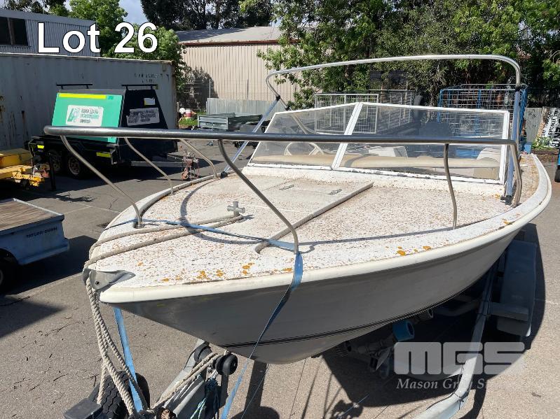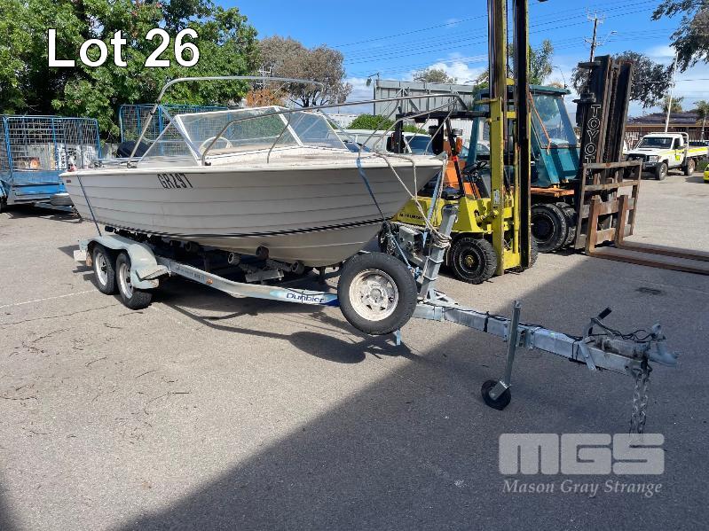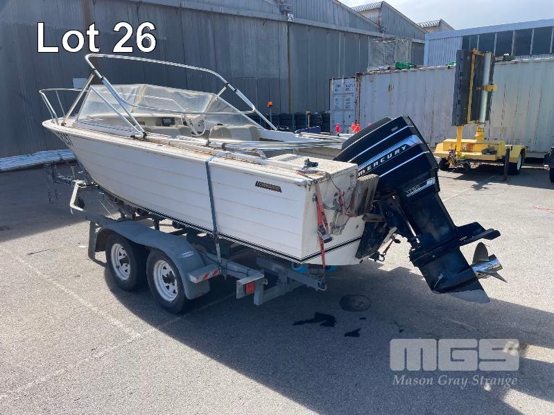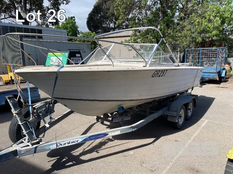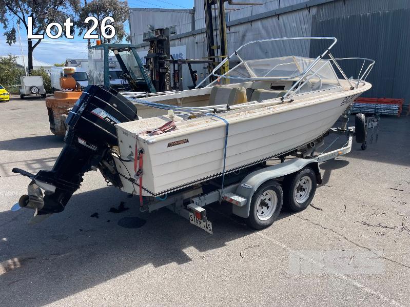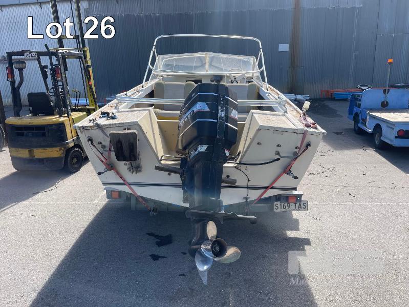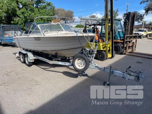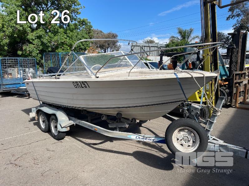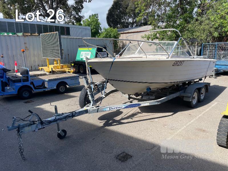 FIBREGLASS BOAT, 17' HIN: AU-TSA054801CN2 GRAYWILL COMMANDO MERCURY 1750 OUTBOARD ENGINE POWER TRIM, V6 S/NO: 4303984 QUICKSILVER LASER 2 PROP KEY #20 ON DUNBIER TRAILER REG: S169 TAS VIN: 6FJDDD33322224419 DUAL AXLE CABLE BRAKES 50mm COUPLER REG PAPER FOR TRAILER