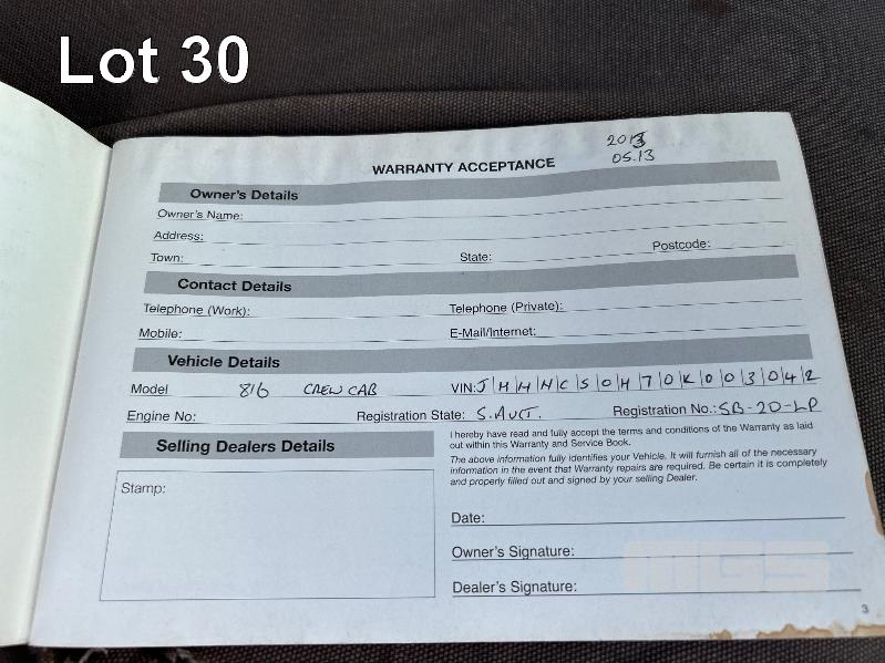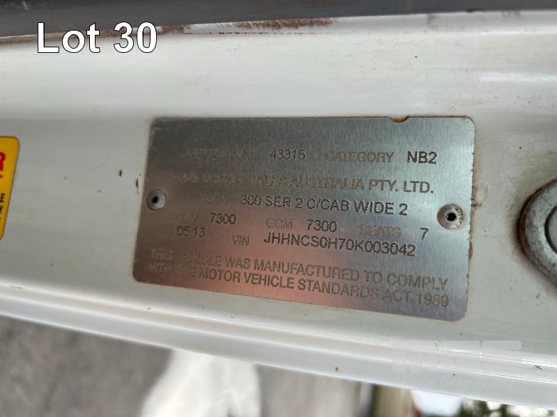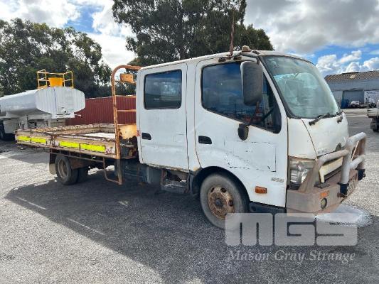 2013 HINO 300 SERIES, XZU730R, CREW CAB, TRAY TOP TRUCK, 4x2 REG: SB 20 LP (SA) VIN: JHHNCS0H70K003042 ENG: N04CU512603 ODO: 129,746kms SHOWING GVM: 7,300kg GCM: 7,300kg 4.0 LITRE TURBO DIESEL, AUTOMATIC TRANSMISSION, SPRING SUSPENSION, WHITE DUCO, 4 DOORS, 7 SEAT, AIR CON, CD PLAYER, STEEL TRAY, TRAY SIZE: 4400 x 2400mm WITH HINGED DROPED SIDES & REAR, TOW BALL, BATTERY ISOLATION SWITCHES 2 WAY RADIO KEY #15 (WITH PAPERS, WITH 1 KEY/S, WITH OWNER'S MANUAL) CONDITION: TRANSMISSION - ALL FAULTS, LEAKS