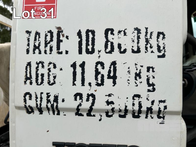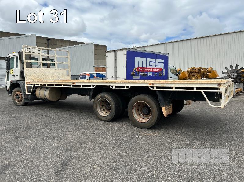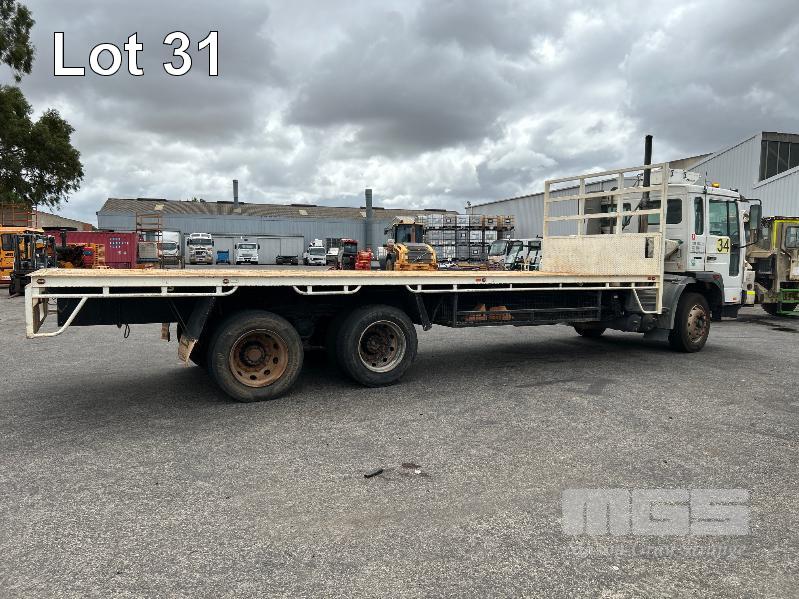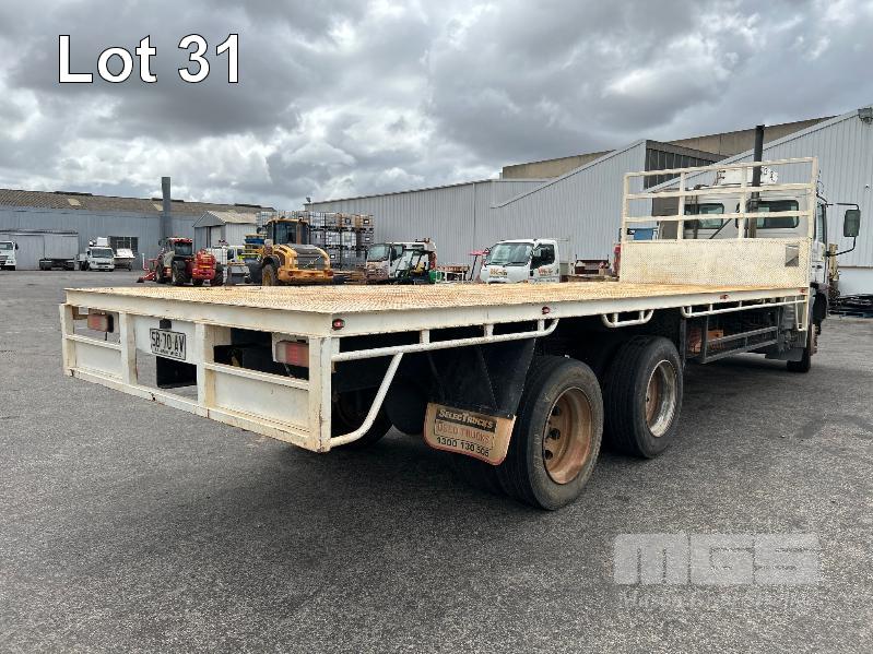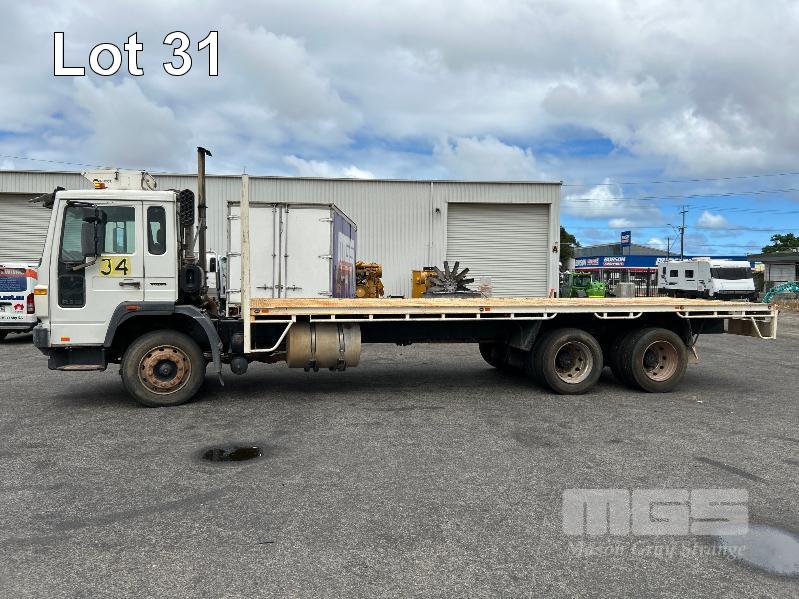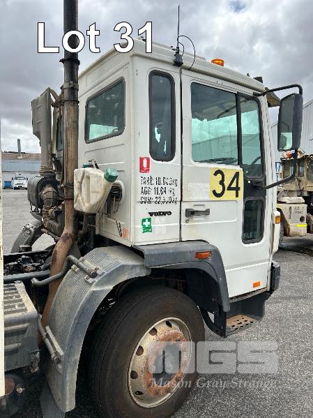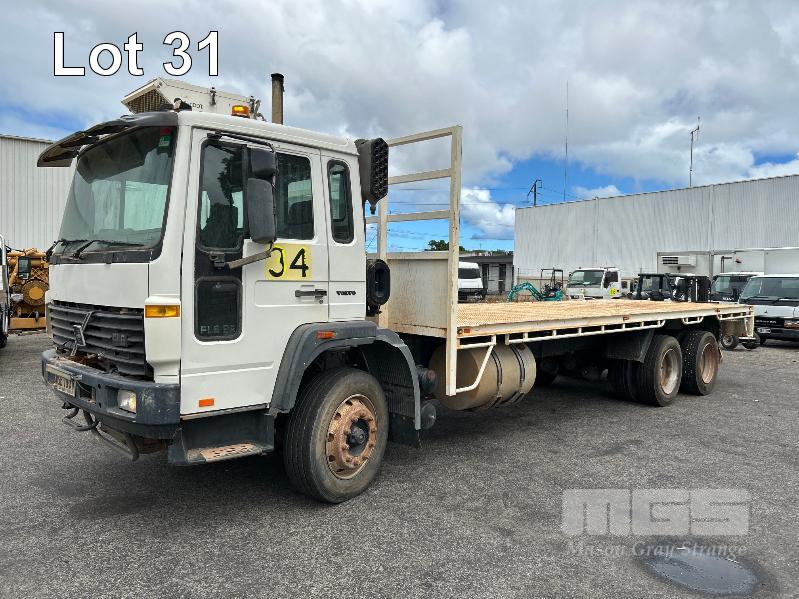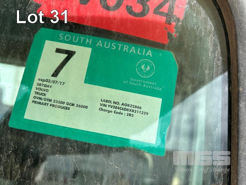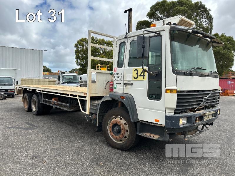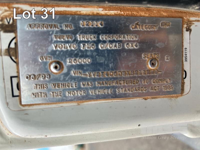 1998 VOLVO FL6 6 x 4 SINGLE CAB TRAY TOP TRUCK REG: SB 70 AV (SA) VIN: YV2E406D8XEB211229 ODO: 291,950kms SHOWING GVM: 23,500kg GCM: 26,000kg 6 CYLINDER TURBO DIESEL, 9 SPEED MANUAL, SPRING SUSPENSION, WHITE DUCO, 2 DOORS, AIR CON, STEEL RIMS, STEEL TRAY, VISOR, UNDER TRAY CARRY CAGE TRAY SIZE 7300 x 2500mm KEY #45 (NO PAPERS, WITH 1 KEY/S, NO OWNER'S MANUAL, NO SERVICE BOOKS)