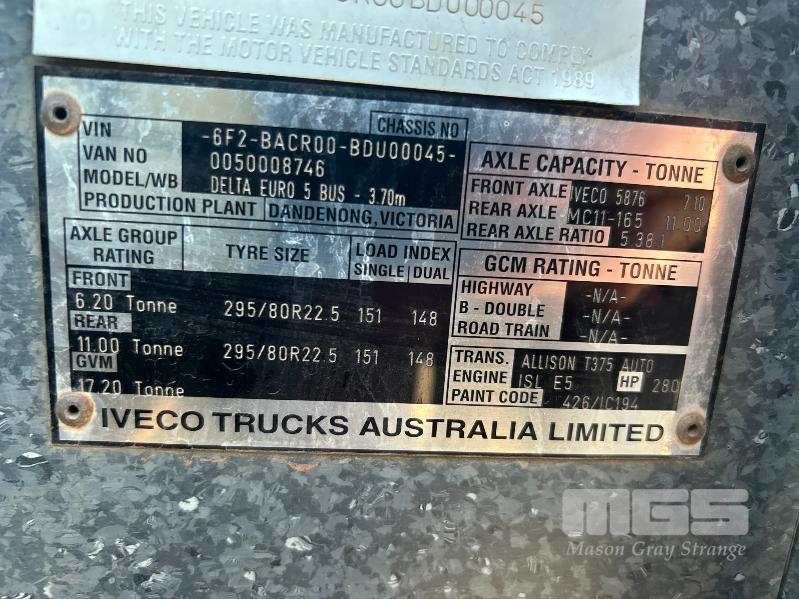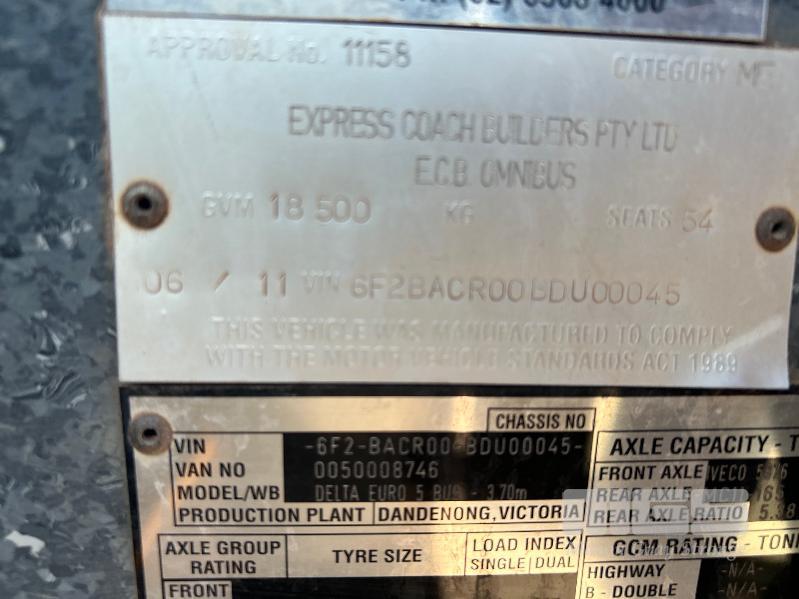 2011 IVECO DELTA EURO 5 BUS, EXPRESS COACH BUILDERS MOD: E.C.B OMNI BUS REG: NO PLATES VIN: 6F2BACR00BDU00045 ODO: 748,857kms ENGINE: CUMMINS 280HP, TURBO DIESEL ALLISON T375 AUTO TRANSMISSION SEATS: 54 PEOPLE ALLOY BULL BAR, ROCK SCREEN, BELLY LUGGAGE STORAGE COMPARTMENT, BATTERY ISOLATION SWITCH, AIR-CONDITIONING SPARE WHEEL WHEEL BASE: 3.70m GVM: 18,500kg PLANT NO: 5032 DAMAGE: ENTRY DOOR SMASHED GLASS WINDOW WITH 1 x KEY KEY #53