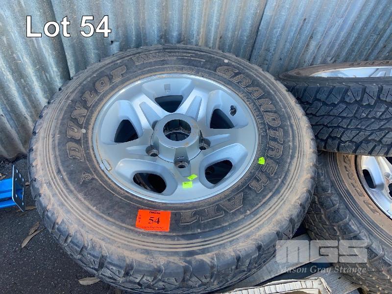 4 x TOYOTA 79 SERIES LANDCRUISER ALLOY RIMS, 5 STUD & TYRES, DUNLOP GRAND TREK ATI SIZE 265/70R16 115 R LT, WITH WHEEL NUTS