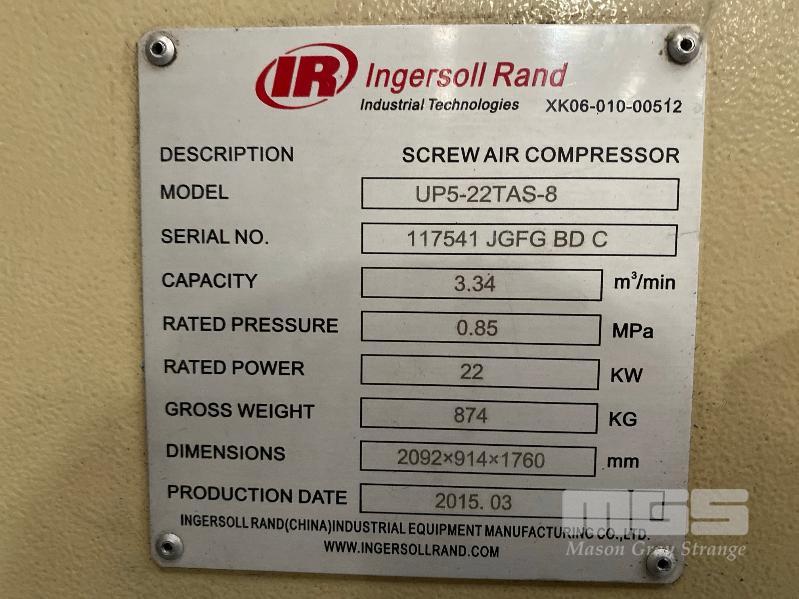 SCREW AIR COMPRESSOR, INGERSOLL RAND MOD: UPS-22TA5-8 3.34m2/MIN 0.88 MPA DOM: 2015 HOURS: 20,584 APPROX SHOWING NOTE: HAS ELECTRICAL FAULT