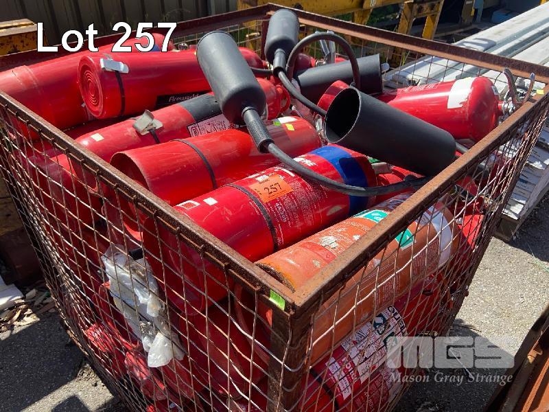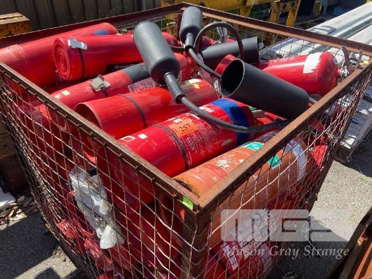 60 (APPROX) x ASSORTED FIRE EXTINGUISHERS IN STILLAGE, VARIOUS SIZES, POWDER & WATER